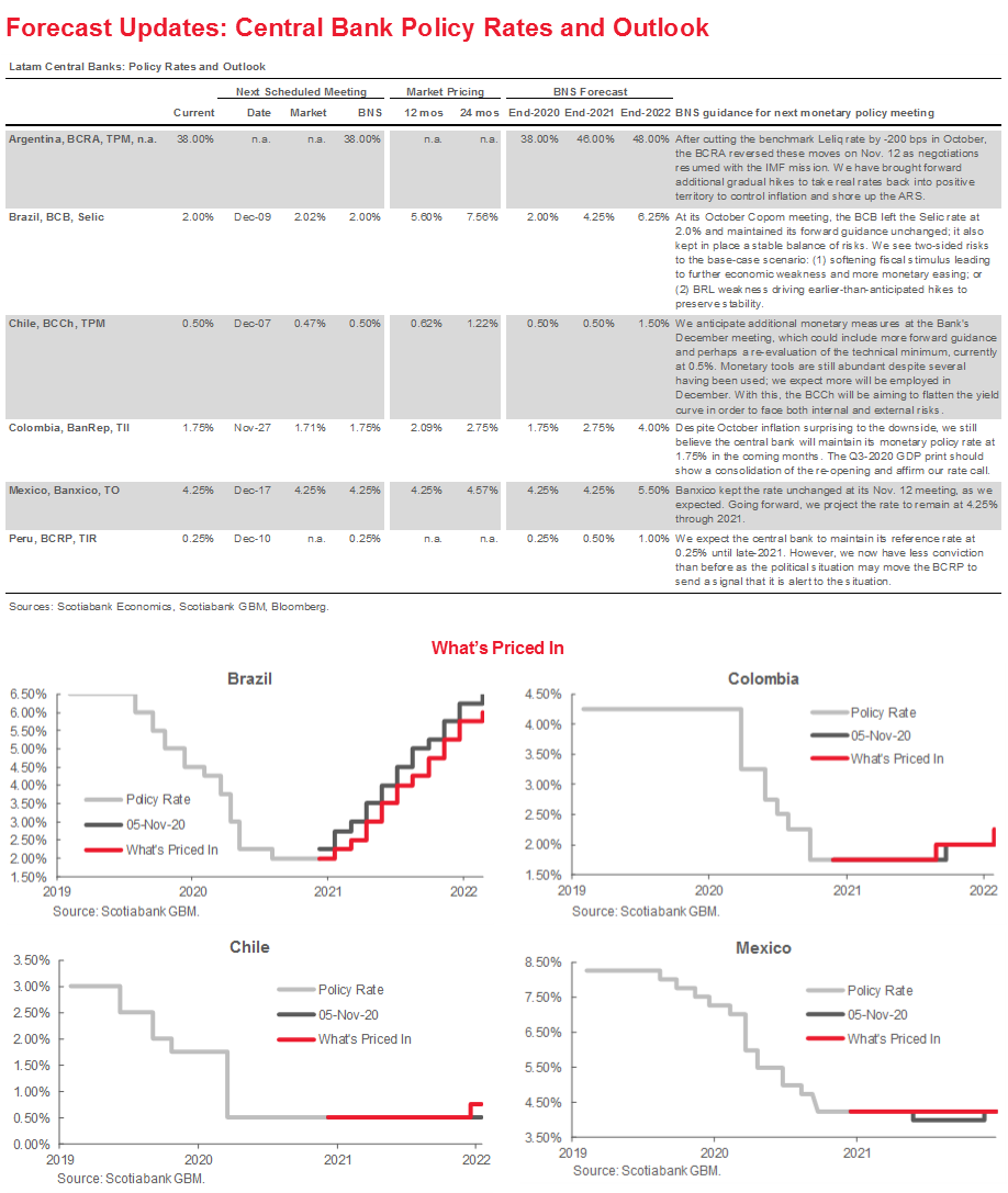 Although we are likely to see ad hoc moves by Argentina’s BCRA to shore up demand for the ARS over the coming weeks, Colombia’s BanRep is the only Latam-6 central bank that has a regularly scheduled monetary-policy decision or publication release during the next fortnight (see Central Bank table, p. 3). The region’s other central banks all have scheduled monetary-policy meetings in the first half of December where all four are expected to keep rates on hold. Brazil is the only case where markets are pricing a return to interest rate hikes early in 2021 (see What’s Price In? charts on p. 3)