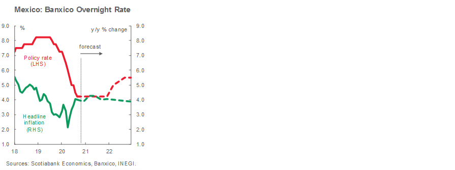 This revision adds conviction to our Mexico City team’s view that inflation will keep Banxico’s Board on hold until early-2022; it also implies a slightly stronger MXN than previously forecast as further rate cuts gets priced out.