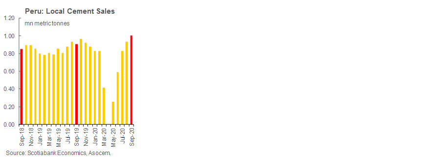 GDP growth for September will be released by Monday, November 16, just after the release of this publication. Our expectation is of an -8% to -9% y/y contraction. With this, GDP will have fallen around -10% y/y, in 2020-Q3. Third quarter GDP and other macro numbers will be released on Friday, November 20. Recent growth indicators have been mixed. Cement demand in September rose nearly 10% y/y (chart), and both mortgage loans and home sales have surpassed year-ago levels. Electricity demand reached year-ago levels in October, but has slipped back into mildly negative territory so far in November. The persisting mobility restrictions for Sundays and night-time business are probably playing a role. On a brighter note, government investment increased 6.6% y/y in October, according to statements by the authorities. This would be the first month of positive growth since the lockdown. Terms of trade have also continued improving, following a trend in place since June. Gold, silver, copper and zinc prices are all outperforming expectations.