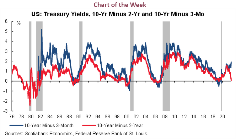 So, what are financial markets telling us about recession risks? The answer to this question also requires separating the signal from the noise. There is much to process. For example, as Scotiabank’s team in Bogota note below, since the start of the year, Latam and global financial markets have been roiled by large shocks that have generated increased volatility. Geopolitical risk has obviously spiked in the wake of Russia’s unwarranted invasion of Ukraine, which has raised questions about the future of globalization. Commodity prices, from oil and metals to wheat and other foodstuffs, have risen. And, as if that wasn’t enough, the Fed has in recent days adopted a more-hawkish tone. Today’s solid job growth numbers do nothing to soften that message.