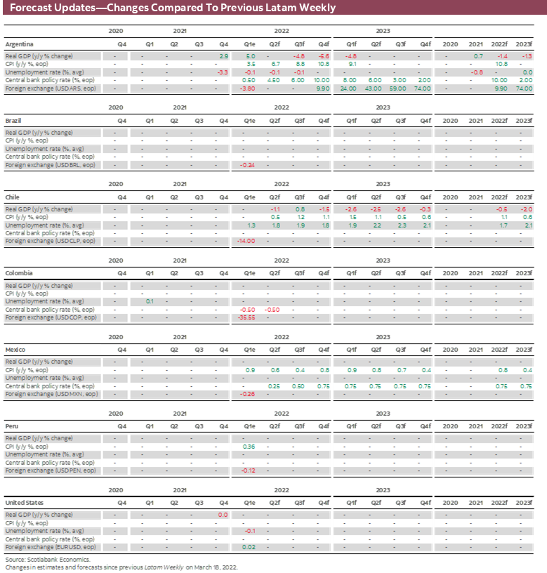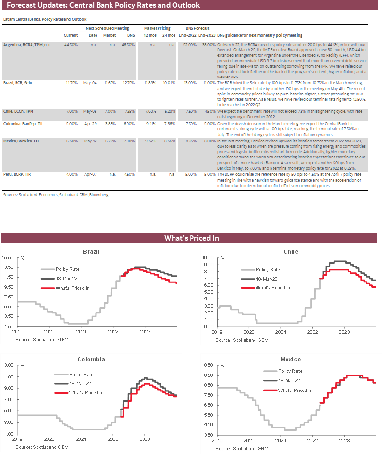 - Commodity price shocks resulting from Russia’s invasion of Ukraine and their potential impact on the global economy introduce additional uncertainty to the outlook for the Latam region. In Chile, Scotiabank’s economists now expect a recession later in 2022 as higher interest rates bind. Our other economists update their views of what heightened uncertainty could entail for their economies in the forecast tables below.