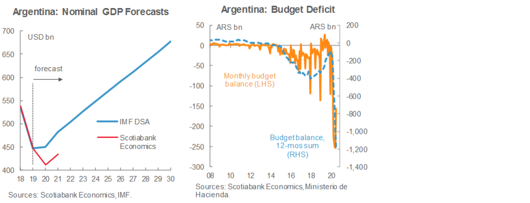 The IMF’s 2020 debt-sustainability analysis (DSA) laid out a need for between USD 55 bn and USD 85 bn in debt relief over the next decade and further work is required to obtain a financial framework under which these amounts would be adequate. The IMF staff’s technical note explained that, “The lower end of this cash-flow relief is associated with a scenario that assumes more advantageous funding conditions to meet payments due to the Fund and other official creditors.”. The external debt swap will provide about USD 42 bn in debt relief over the coming decade, while the domestic swap should add another USD 20 bn in relief, for a total of USD 62 bn—inside the bottom of the IMF DSA’s range, but the conditions consistent with this range haven’t yet been secured. Nominal GDP is coming in substantially below the DSA’s forecasts and federal deficits are substantially wider than the DSA expected (charts). Argentina is nowhere close to a return to international capital markets to make up the difference.