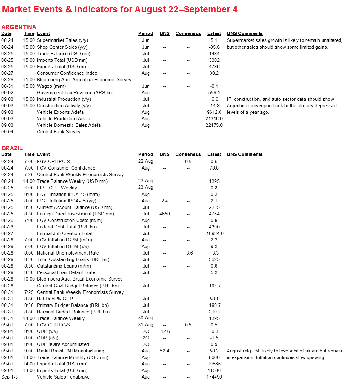 - Brazil will see a spate of inflation readings at the beginning of this week that we expect to confirm an upswing, followed by credit data at the end of the week and Q2 GDP numbers on Tuesday, September 1 that are largely stale at this point. The August manufacturing PMI on the same day is expected to show some slowing in the recovery.