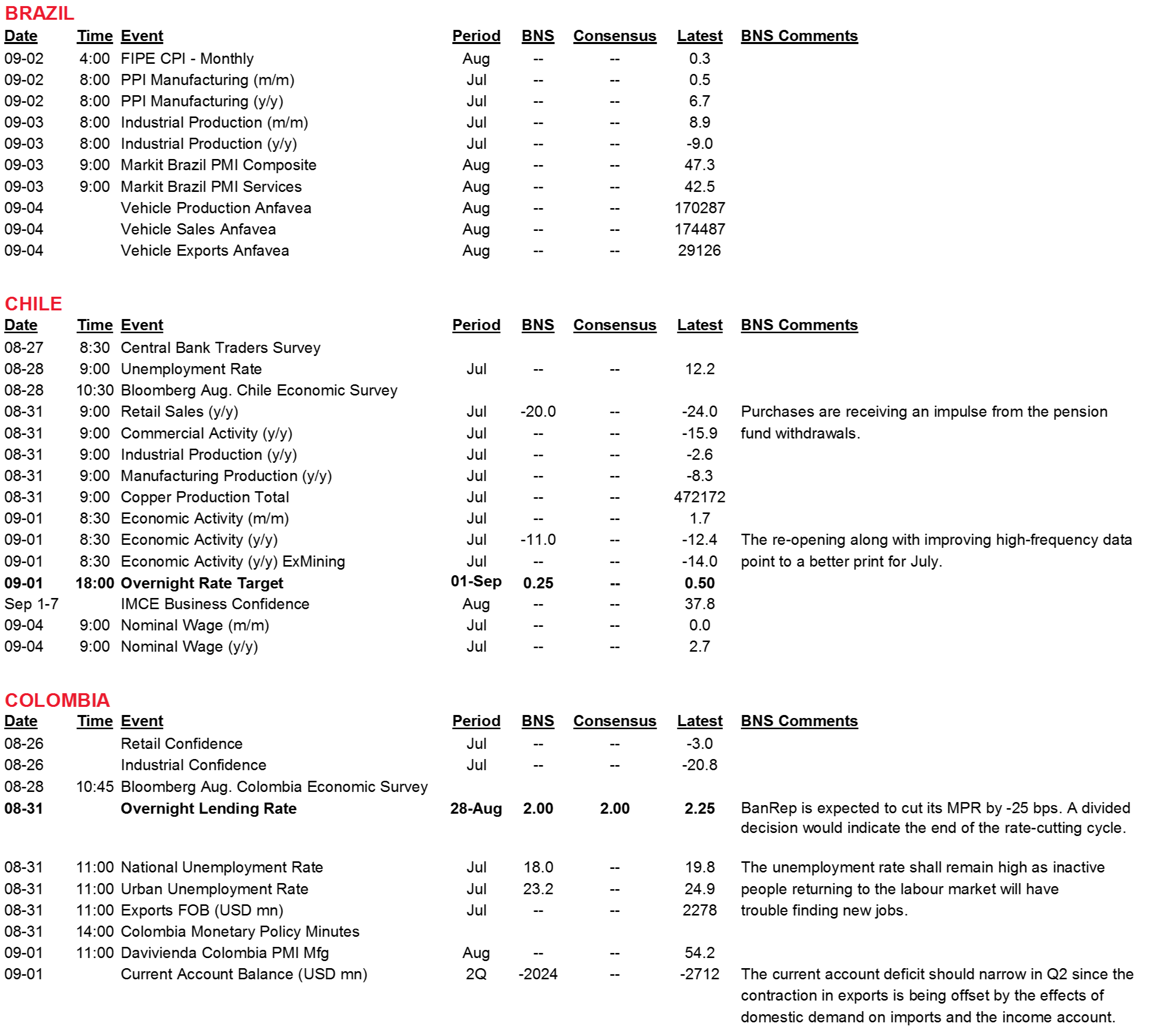 Chile. The BCCh monetary policy committee (MPC) meets on Tuesday, September 1 and our Chilean economists have a strong conviction call that the MPC will deliver a -25 bps cut from the central bank’s current “technical minimum” of 0.50% to 0.25% (see Forecast and Central Bank tables, pp. 2 to 4). The rate decision will be followed by the publication of the BCCh’s quarterly Monetary Policy Report on Wednesday, September 2, where we expect the BCCh to lay out its review of monetary policy and make the cases for a revision in its working floor for the nominal monetary policy rate.