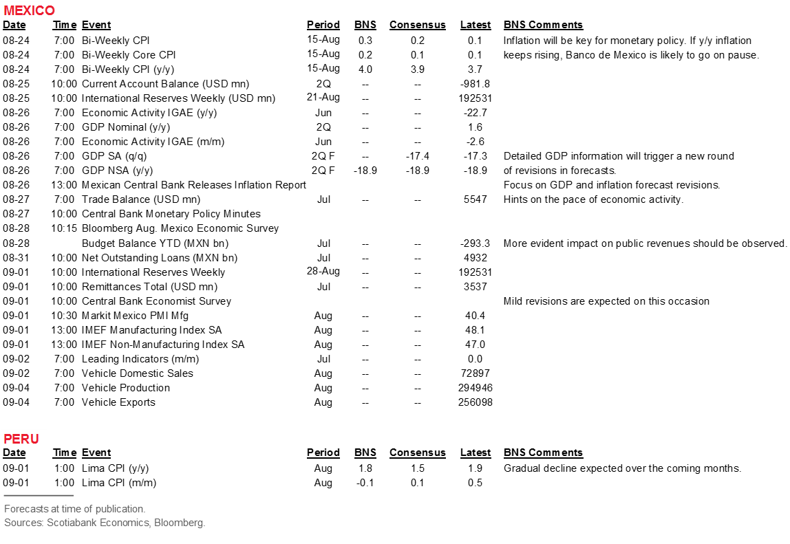 - Mexico. Bi-weekly inflation on Monday, August 24 will be a key determinant of next steps by Banxico and our team in Mexico City expects the pace of price increases to edge upward, adding support to their view that Banxico is now on a long hold. Q2 GDP on Wednesday, August 26 will be combed over for detailed data that will underpin our next set of forecast revisions and provide detailed context for Banxico’s Quarterly Inflation Report.