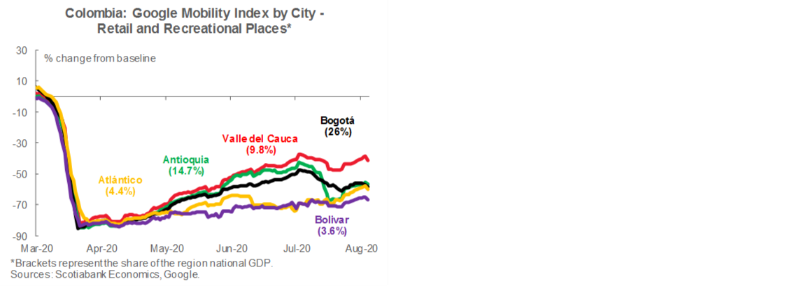 By the end of August, Colombia will have completed more than five months under isolation measures and—although Central Government Decrees have allowed the opening of somewhat more than 90% of economic activities—the execution of this unlocking is not the same across all regions. The implementation of those plans is the responsibility of regional government leaders. One special case is the capital city, Bogota, which since July 13 has implemented strict quarantines by neighborhood groups and now is considered the part of the country with the strictest measures and the highest economic cost. Unfortunately, Bogota is still far from showing a stabilization of the pandemic spread. That said, economic activity recovery in Colombia has been unequal by regions and the service sectors are the most affected. Employment has fallen -20% compared with pre-COVID levels, while labour income has fallen by -1.5% of GDP. Both are facts to keep an eye on since, if the demand weakens more, the production side of the economy has limited room to improve.