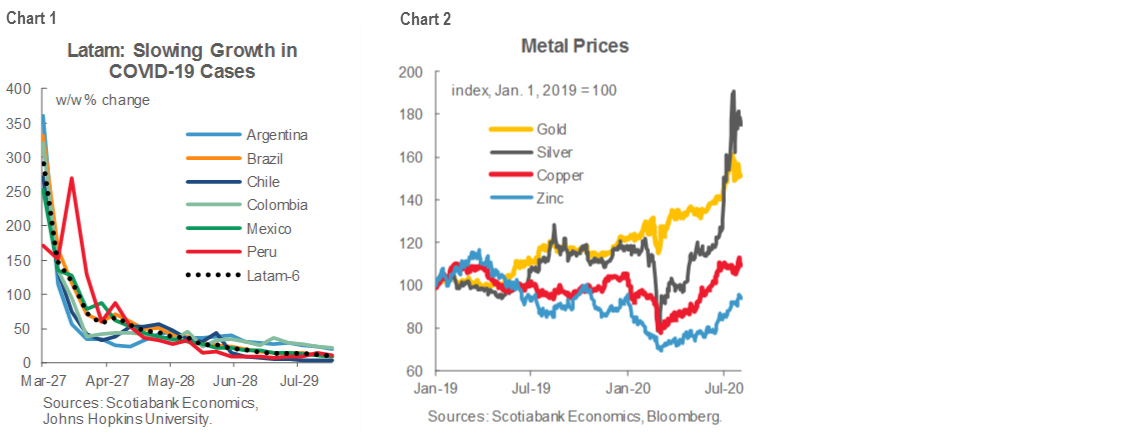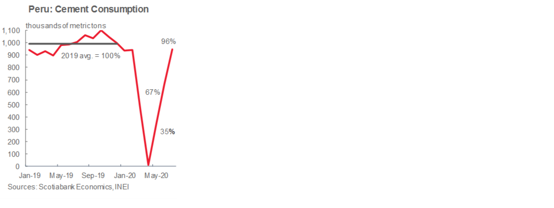 GDP growth contracted -18% in June in y/y terms which, however, represented a 20% rebound in m/m terms. Early July-August figures are even more interesting. Electricity demand has gone from a -30% y/y contraction during the lockdown back to nearly pre-COVID-19 levels in mid-August. Cement demand, which was almost nil in April, was less than 5% off y/y levels in July. Fishing GDP will have another stellar month in July to match its 48% y/y growth of June, and copper output, down only -9% y/y in June, could well have recovered fully in July. Overall, our forecast is that GDP in July will be down -8% to -10% in y/y terms, halving the contraction that took place in June which, in turn, was well off the -40% contraction during April—the floor of the downturn.