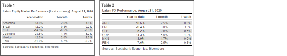 While the FOMC’s Minutes released on Wednesday, August 19 provided some mixed signals for risk assets, Latam markets over the last week responded mainly to local narratives (tables 1 and 2). The biggest story was the political schism in Brazil between the Executive and the Senate, which pushed the BRL down -3.5% on the week and nudged the sovereign curve marginally wider (see the Key Market Charts section). Argentina equities slid -4.5% on strong, but weaker than expected, growth numbers; meanwhile, Colombian equities advanced on better coincident indicators and soft inflation expectations that could spur further monetary easing.