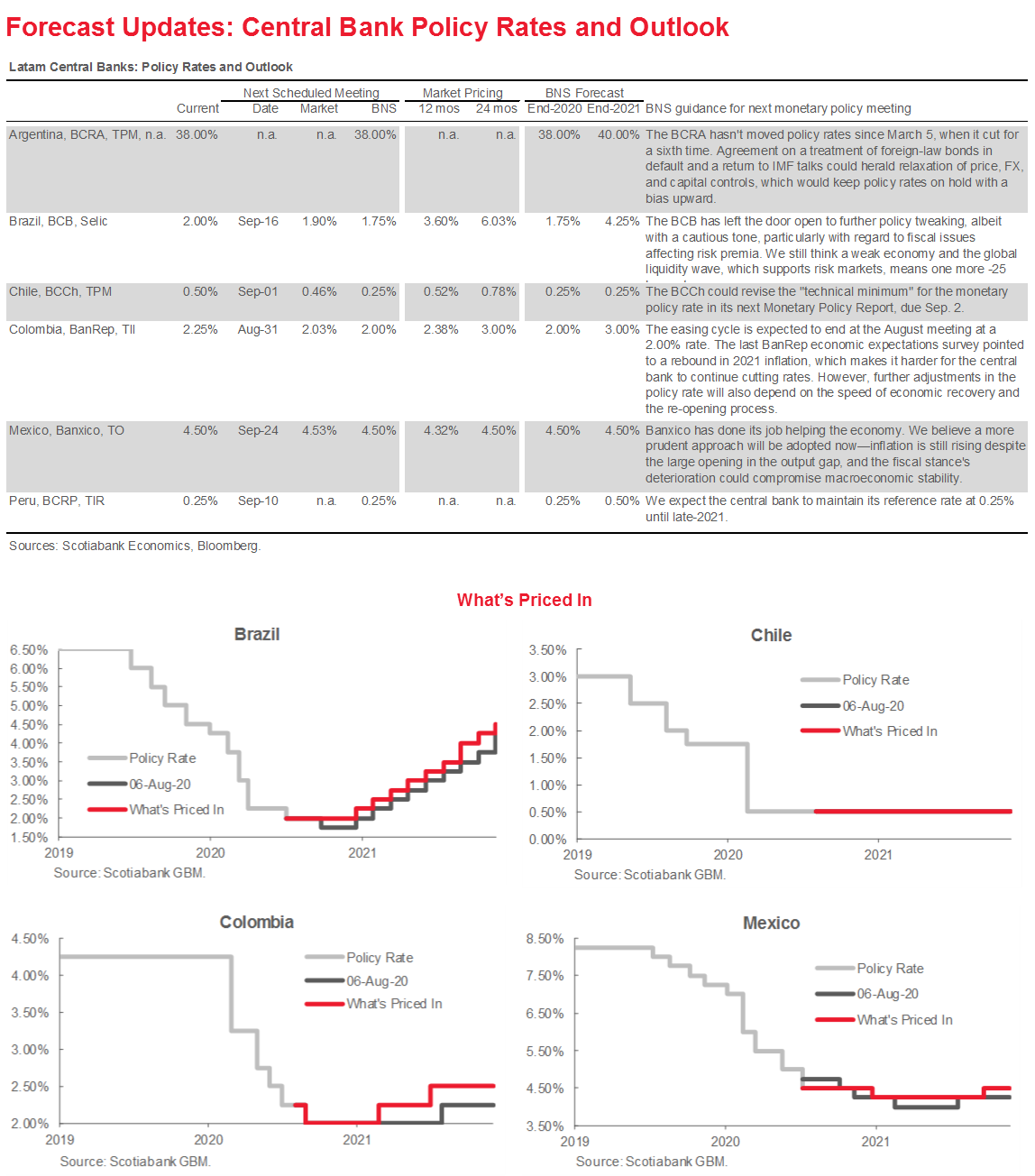 All in all, our GDP forecast for 2020 remains at -7.5%, but positive surprises may arise if re-opening plans accelerate. This scenario is compatible with an expectation of a rate cut of 25 bps at the August 31 Monetary Policy Meeting. Further cuts could take place if economic recovery shows negative surprises, but it is not our base case scenario.