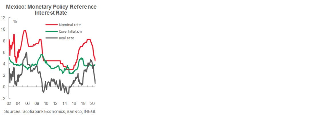 · Is not clear if the benefits of easing outweigh the risks. After a rapid reduction of 375 basis points in the reference rate, Banxico has done its job to provide some relief to households, firms and the government, and prevent a credit crunch in financial markets. The reference interest rate has now reached the same level at which the easing cycle that followed the global financial crisis of 2009 stopped for a long pause, after which there was some more easing in 2013 (see graph). At that time, core inflation was below 3% and descending, remaining below 3% and even close to 2% for a couple of years, while it is now rising and causing some concern.