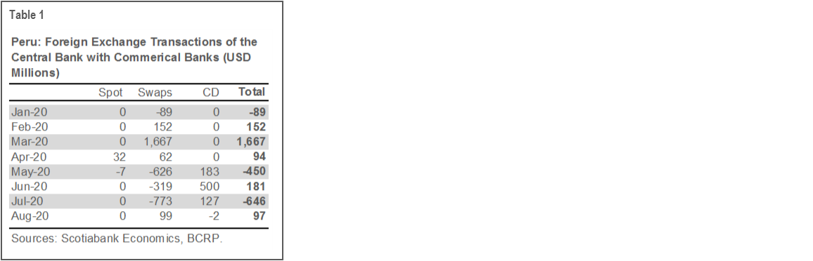 3. The central bank was less active in the FX market during the move towards USDPEN 3.58. The BCRP has been absent from the spot market since May and did not roll all its maturities of FX swaps during May, June and July, resulting in a net demand for USD, which did not help to tame the depreciation trend (table 1).