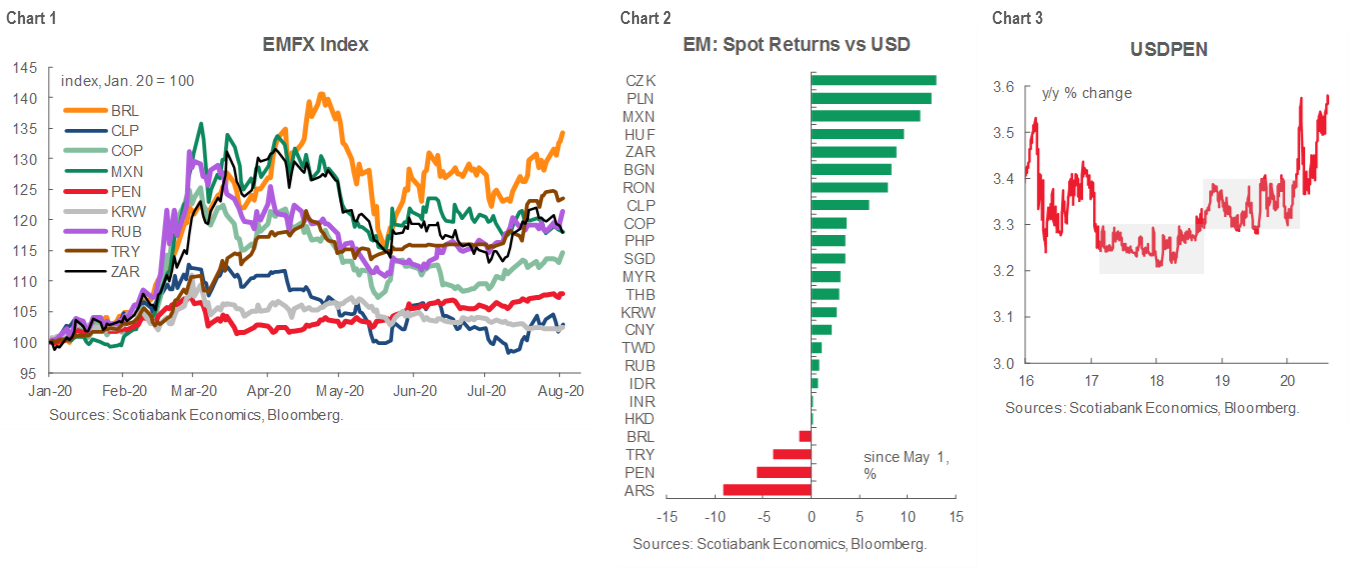 The Peruvian sol (PEN) has been among the most stable currencies in Latam in recent years. Throughout the worst of the financial turmoil that was triggered by the COVID-19 pandemic, PEN remained more resilient and performed better than its EM peers (chart 1). Starting in May, however, as other currencies began to recover, PEN decoupled from the region and started a depreciation trend that has left it as the second worst performer in the last four months, behind only ARS, which went through a dramatic debt restructuring process during this period (chart 2). PEN has moved away from the ranges it has seen in the last couple of years and is currently fluctuating around its all-time low of 3.5847/USD (chart 3).