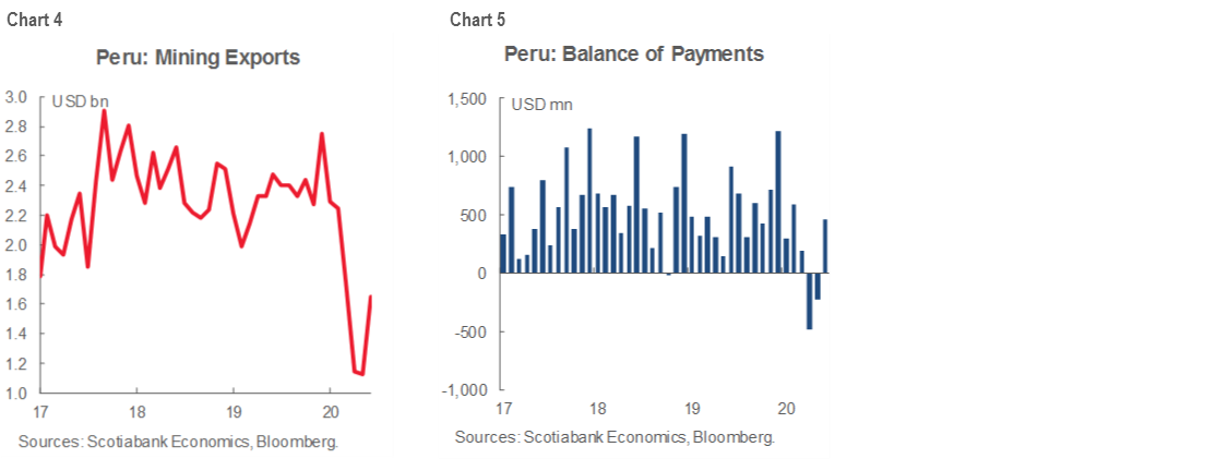 The Peruvian mining industry contracted by -42.3% y/y in April 2020, which marked the bottom of the cycle. But some sub-sectors such as the production of tin and iron stopped completely and others were working at minimum capacity—with zinc production falling by 86.3%, lead by 84.1%, silver by 73.6% and gold by 53.5%. The production of copper, which was the most resilient, fell by “only” 34.7%. As a result of this, we saw a deterioration in the balance of payments in March, April and May.