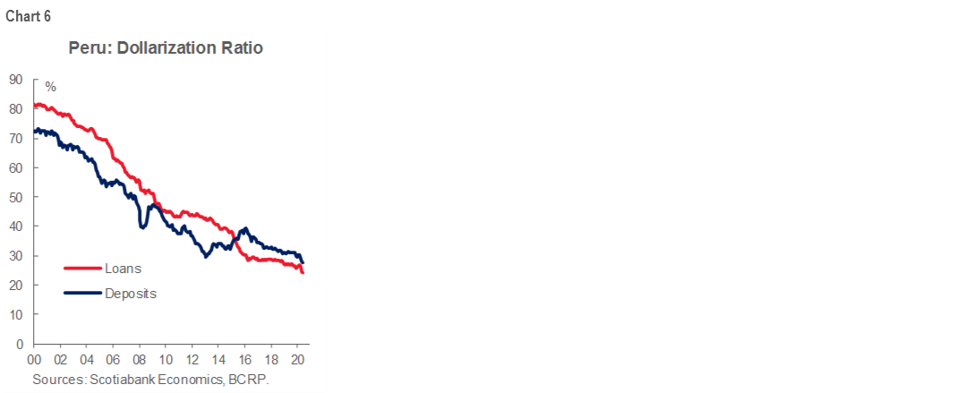 2. Increase in USD demand from the local corporate sector. One of the flagship aid programs of the Peruvian government during the pandemic was the allocation of guaranteed PEN credits to local corporates to help them meet their short-term obligations despite the fall in income that would result from the collapse in consumption and economic activity. The program started with a target of PEN 30 bn and was extended to PEN 60 bn in credits. Given the high level of dollarization of the Peruvian economy (chart 6), a large portion of these loans in local currency hit the FX market to be exchanged for USD. According to the Central Bank, up until August 12, PEN 51 bn of the total amount had been delivered to commercial banks and, from that, about PEN 40 bn has reached Peruvian corporates. There is no official data on the exact volumes in the FX market, but our local trading desk estimates that about PEN 6 bn (15% of the allocated credits) were used to buy USD. That volume becomes more relevant if we consider that the COVID-19 crisis triggered a significant fall in the daily spot volume, which went from PEN 450 mn to about PEN 250 mn according to our estimates.