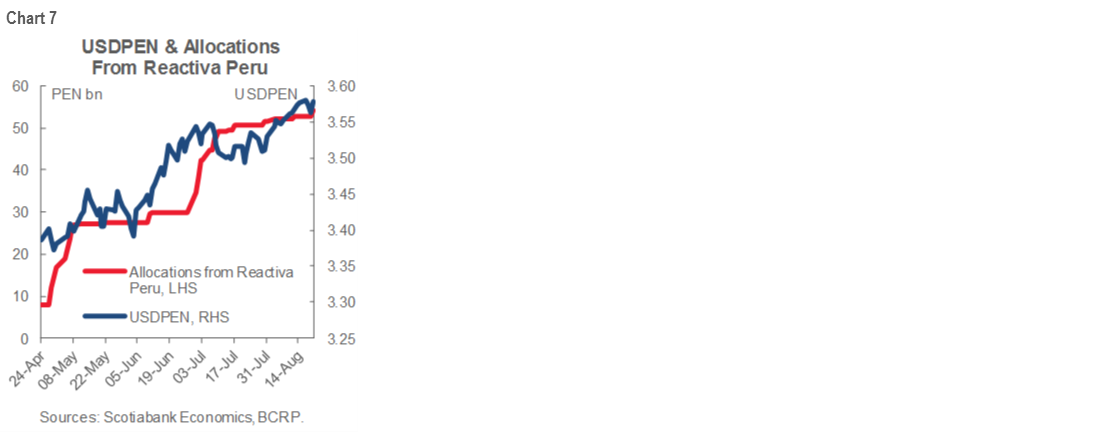 The calendar is full of tier-1 indicators coming out in the following weeks. On August 28 we will know the employment figures for July, and on August 31, sectoral data will be released. We estimate retail sales will show a drop of around -20% y/y in July, while August will reveal in its fullness the withdrawal of pension funds that will contribute "at least" 10 ppts to retail sales that month. Regarding the withdrawal of pension funds, up until August 18, more than 9 mn people have requested a withdrawal, and 7.2 mn have received part of their funds. In total, around USD 10 bn have been paid to pension fund contributors, and we anticipate more transfers in the following days. Finally, monthly GDP for July will be known on September 1, where we expect a contraction around -11% y/y. That same day, the central bank will hold its September meeting, where we expect some discussion about the revision of the technical minimum, currently at 0.5%.