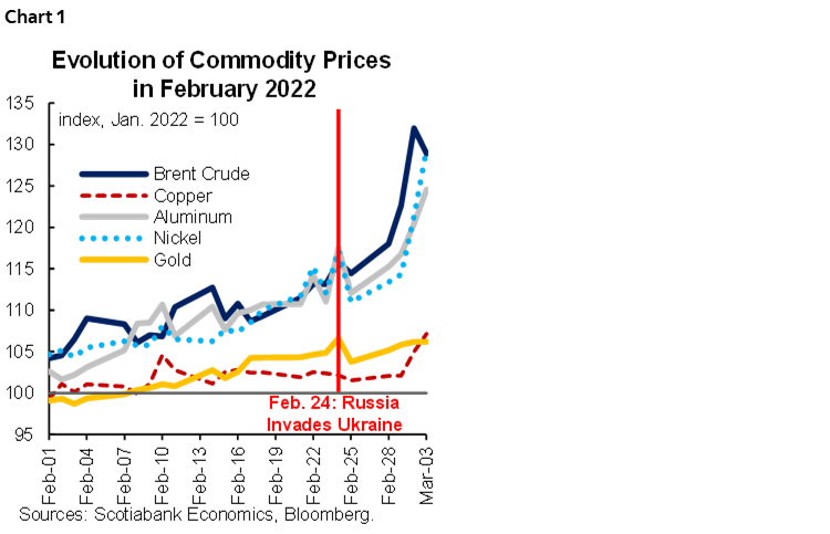 The impact on commodity markets is both clearer, as Scotiabank’s Marc Desormeaux notes, and of direct importance on the Latam region. Most commodity prices have continued the upward trajectories they had mapped out prior to the invasion (chart 1). Oil has been the most obvious beneficiary of the war given Russia’s share of global production, with oil prices rising to $ 118/bbl in trading on March 4th. But given Russia’s role as a major producer of copper, nickel, and aluminum the potential for supply disruptions has likewise pushed these prices higher. Meanwhile, the prospect that shipments of wheat and other cereal from Ukraine could be disrupted has also pushed their prices to record levels on international markets. And with the prevailing uncertainty as to how the conflict will play out, there is material upward pressure on commodity prices going forward. That scenario, should it play out in the weeks and months ahead, does not bode well for inflation.