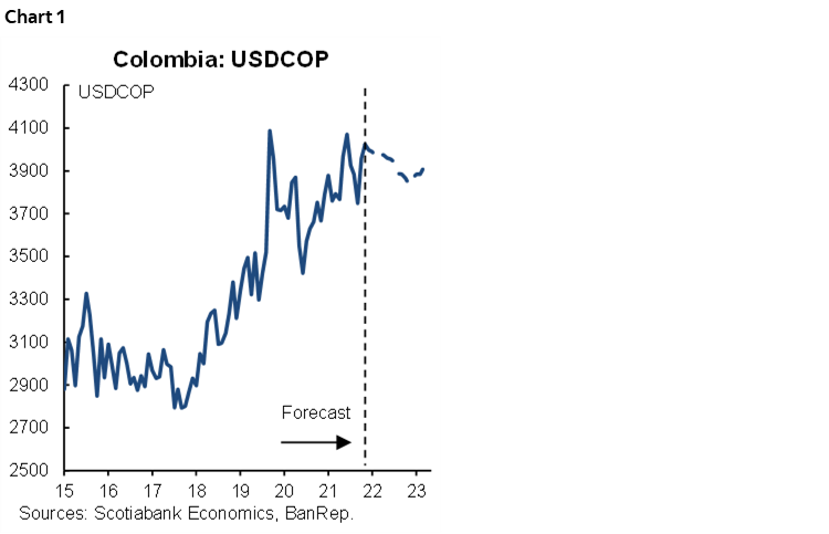 Regarding markets, the presidential results point to new information that impacts our current FX projection. On the Tuesday after the elections, the FX reversed the gains shown after the first round, indicating that a new premium was structurally priced in the USDCOP. As a result, we revised our forecast FX path for 2022 and 2023 (chart 1). We now expect the exchange rate to hover around 3,980 pesos in the second half of 2022 and around 3,900 in 2023. Despite high commodity prices, we think that a stronger US dollar from Fed tightening and some degree of political risk premium will prevent the FX from appreciating significantly in the medium term.
