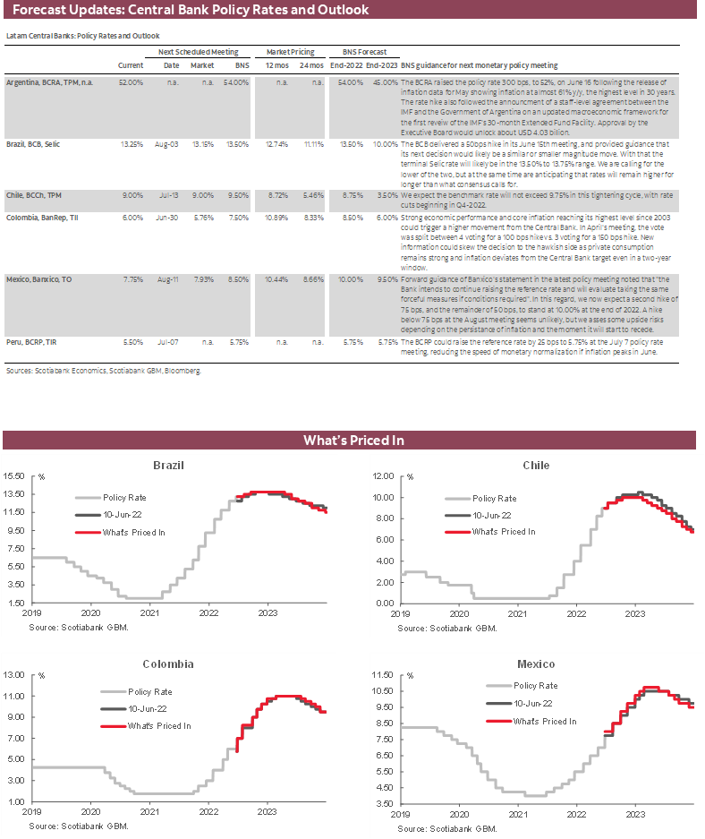 - Aggressive policy rate hikes by the Fed and other advanced economy central banks, with signals of more to come, have led Scotiabank economists to revise their projections. See the full set of changes in the forecast tables below.