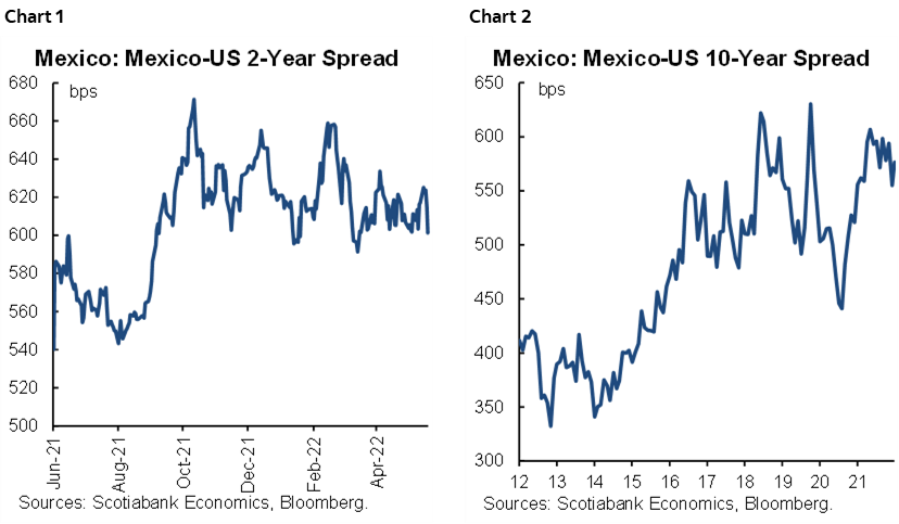 Despite the positive signal, however, pricing intentions remain an overwhelmingly upward risk to inflation in Mexico, which we believe warrants a continued hawkish stance by the central bank—in addition to the need to preserve the spread relative to the Fed which we discussed above. In this respect, the latest Banamex survey of private expectations saw yet another upwards drift in expected 2022 inflation, with consensus now looking for 7.05% year-end inflation (5 bps higher than the previous print). The consensus expectation for 2023 also moved 5 bps higher, to 4.43%. We expect inflation will peak in Q3-Q4 but will remain relatively sticky to the downside.
