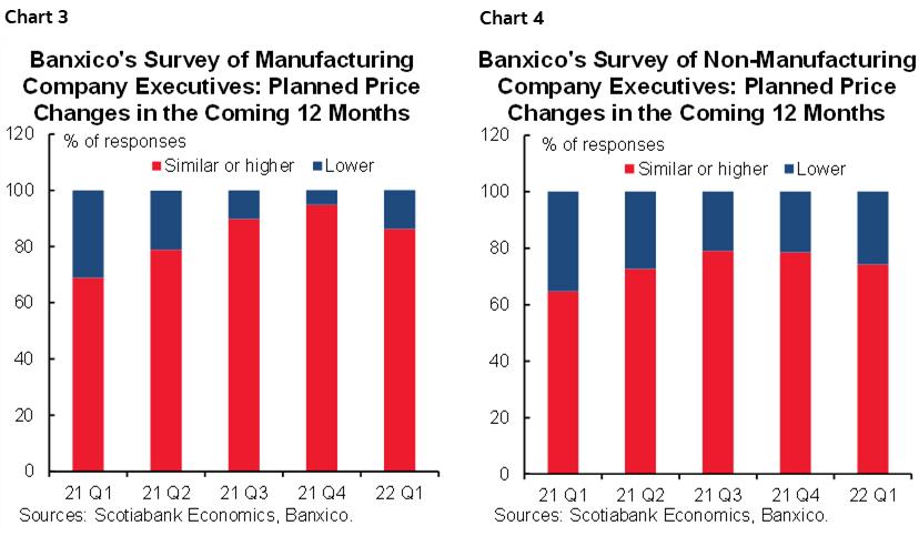 At the same time, there is some good news on the inflation front. In the latest Banxico survey of company executives’ plans for price changes in the coming 12 months, the share of executives who plan to increase their prices at a similar or faster pace declined somewhat relative to the previous quarter (charts 3, 4). The share of manufacturing sector executives planning similar or faster increases is 86% (down from 94%), and in the service sector the share that plans similar or faster increases is 74% (down from 79%).