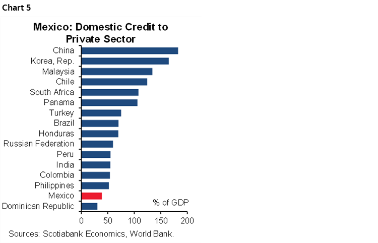 Another reason why we believe caution from Banxico is warranted, is the relatively shallow transmission channel Mexico has for monetary policy. Even by emerging market standards Mexico has abnormally low financial sector penetration (credit/GDP near 40%), which means that rising rates have a much shallower channel to affect the economy than in countries with comparable income levels (chart 5). This makes Banxico a central bank that is not well-placed to “chase inflation”. We therefore expect Banxico to continue to at least match the Fed’s hiking pace over coming months.