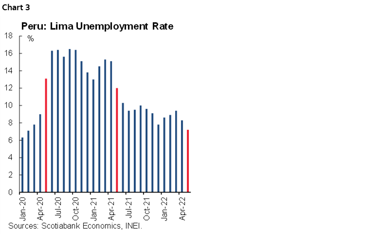 Employment has been a pleasant surprise recently. Unemployment in Lima fell to 7.2% in May, down from 8.3% in April, and from 9.4% in Q1- 2022 (chart 3). Mining and agroindustry led in jobs growth. Agroindustry is easy enough to understand, as the sector has been expanding non-stop for some time now. As for mining, one may assume that employment growth is linked to the new Minas Justa and Quellaveco projects coming on stream.