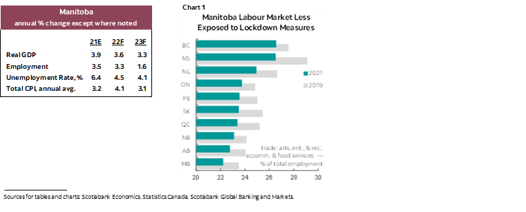 Small high-contact industry presence may prevent more severe economic hit from omicron wave. Manitoba’s economy and labour market are less concentrated towards retail and sectors related to tourism and accommodation than most other provinces (chart 1); that helped mitigate the size of the downturn during past lockdown periods.