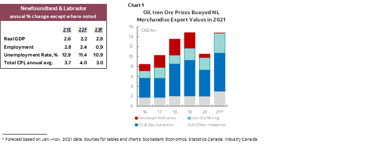 Oil production outlook still weak. With the Terra Nova field shuttered, offshore output was down by 9% y/y ytd as of November 2021—if maintained in December, that would represent the worst result since 2015 when operational issues and natural declines drove a 21% plunge. In 2019, Terra Nova accounted for 12% of provincial production. The government only expects operations to resume in late 2022; that should generate a boost in 2023.