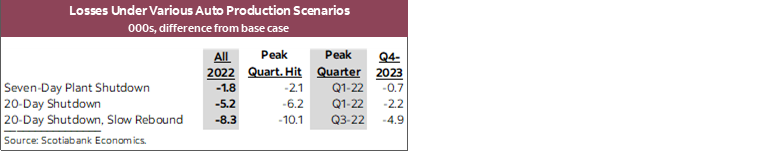 - Similarly, our model of the Ontario economy associates bridge and supply chain-related auto production disruptions with total job losses of between 2k and 8k in the province in 2022.