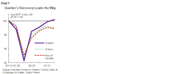 - Quebec is in position to lead all Canadian jurisdictions in economic growth this year; Ontario is trailing but virus control since Q2-2021 and auto sector recovery should support a rebound in the coming months.