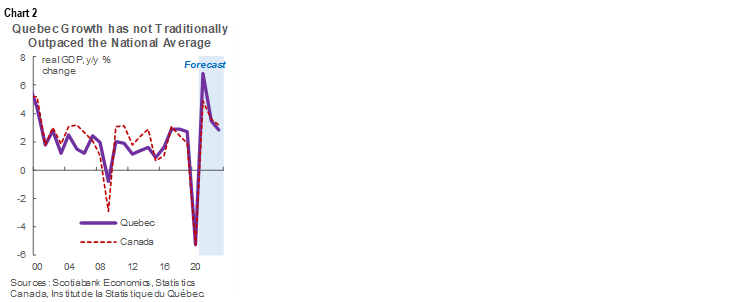 This is noteworthy because such economic outperformance is unusual in Quebec (chart 2, p.1). Canada’s second-largest province experienced a growth spurt in the three years before the pandemic. Yet, most economists estimated that its long-run potential economic growth was below that of the country as a whole given modest business investment levels and an aging population. Now, the province’s economic expansion looks poised to lead all Canadian jurisdictions for the first time in recorded history.