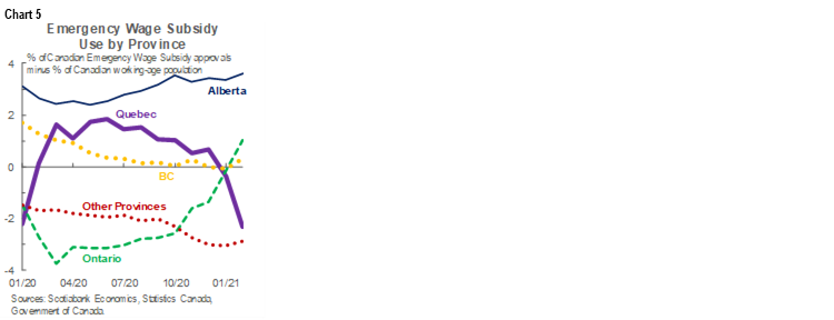 Government policy support helped offset income losses. For instance, Quebec’s share of approved Canadian Emergency Wage Subsidy (CEWS) claims exceeded its share of Canada’s working-age population for most of 2020 (chart 5). Only in Alberta—which experienced a far steeper economic contraction—were there more CEWS approvals per capita. A generous package of provincial income tax deferrals—initially estimated to have injected $4.5 bn into the Quebec economy—likely helped as well.