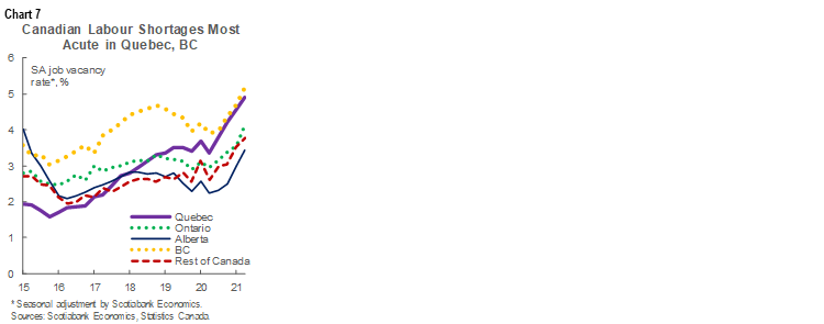 Others should persist to some degree. Semiconductor shortages and auto production weakness look increasingly likely to spill into 2022. We do expect some easing of these constraints as we progress through 2021, which should generate strong Ontario export growth into 2022. More broadly, input product shortfalls and inflation should linger, and both Quebec and Ontario have reported strong GDP deflator advances in the first half of this year. We foresee reductions in the large numbers of unfilled jobs reported across Canada (chart 7) assuming that supply chain issues are unwound and COVID-19 caseloads remain manageable. Yet, as we argued here, these represent significant impediments to growth, and can only be meaningfully addressed in the long run with assertive and nimble responses from policymakers and businesses.