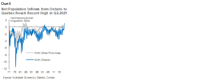 Demographic trends may signal a structural shift in provincial economic patterns; if maintained, those could put Quebec on a structurally stronger growth path. While increased provincial targets for immigrant admissions—which we have argued are essential to long-run growth—to combat labour shortages are certainly positive, interprovincial migration trends are even more striking. Net outflows from Ontario to Quebec reached their highest-ever recorded level in the second quarter of this year (chart 8). This at least partly reflects the prevalence of telework during the pandemic and Quebec’s edge on housing affordability, both of which will likely persist in the next couple of years. A modest Western Canadian energy sector investment outlook is also constructive for net migration to Quebec.