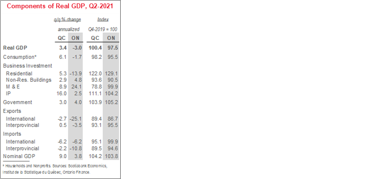 The strength of Quebec’s economic rebound from COVID-19 has been nothing short of remarkable. In Q3-2020, its real GDP rose by nearly 60% (q/q ann.), much stronger than the roughly 40% increase witnessed across Canada. The province’s economy also continued to grow in Q2-2021—it expanded by a solid, albeit easing 3.4% annualized pace—in stark contrast to the 1.1% contraction reported at the national level. That momentum has resulted in Quebec’s output exceeding Feb. 2020, pre-pandemic levels in the five months to July 2021. Even zero gains for the rest of the year (and no revisions to history) would give annual growth of 6.5%—an all-time record and well above the 4.9% advance we have penciled in for Canada in 2021.