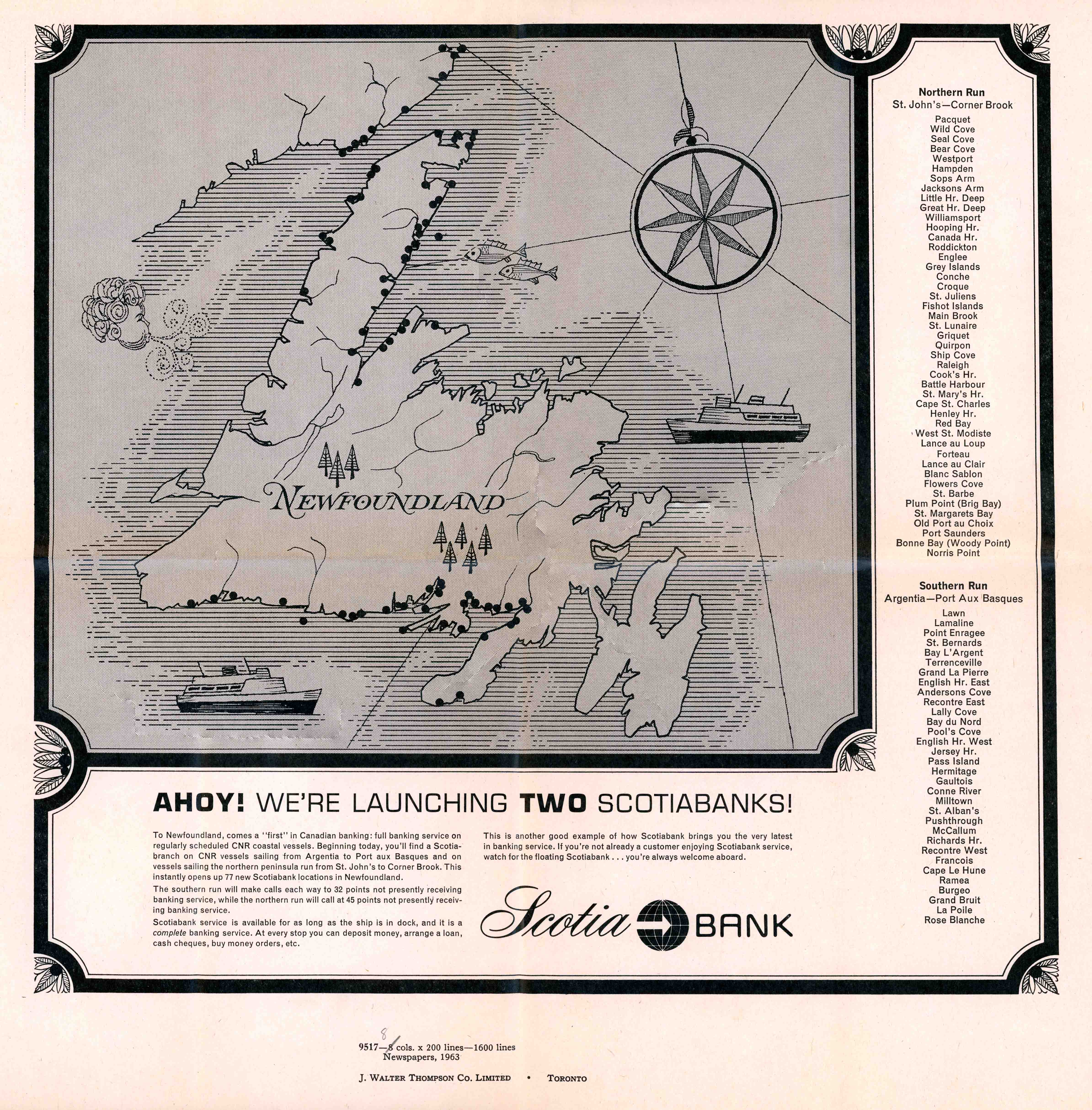 1963: Banking by Boat Newfoundland was the first to get an innovative type of branch — full banking service on regularly scheduled coastal vessels. "You'll find a Scotia-branch on CNR vessels sailing from Argentia to Port aux Basques and on vessels sailing the northern peninsula run from St. John's to Corner Brook. This instantly opens up 77 new Scotiabank locations in Newfoundland," the Bank said in an advertisement at the time. "If you're not already a customer enjoying Scotiabank service, watch for the floating Scotiabank...you're always welcome aboard."