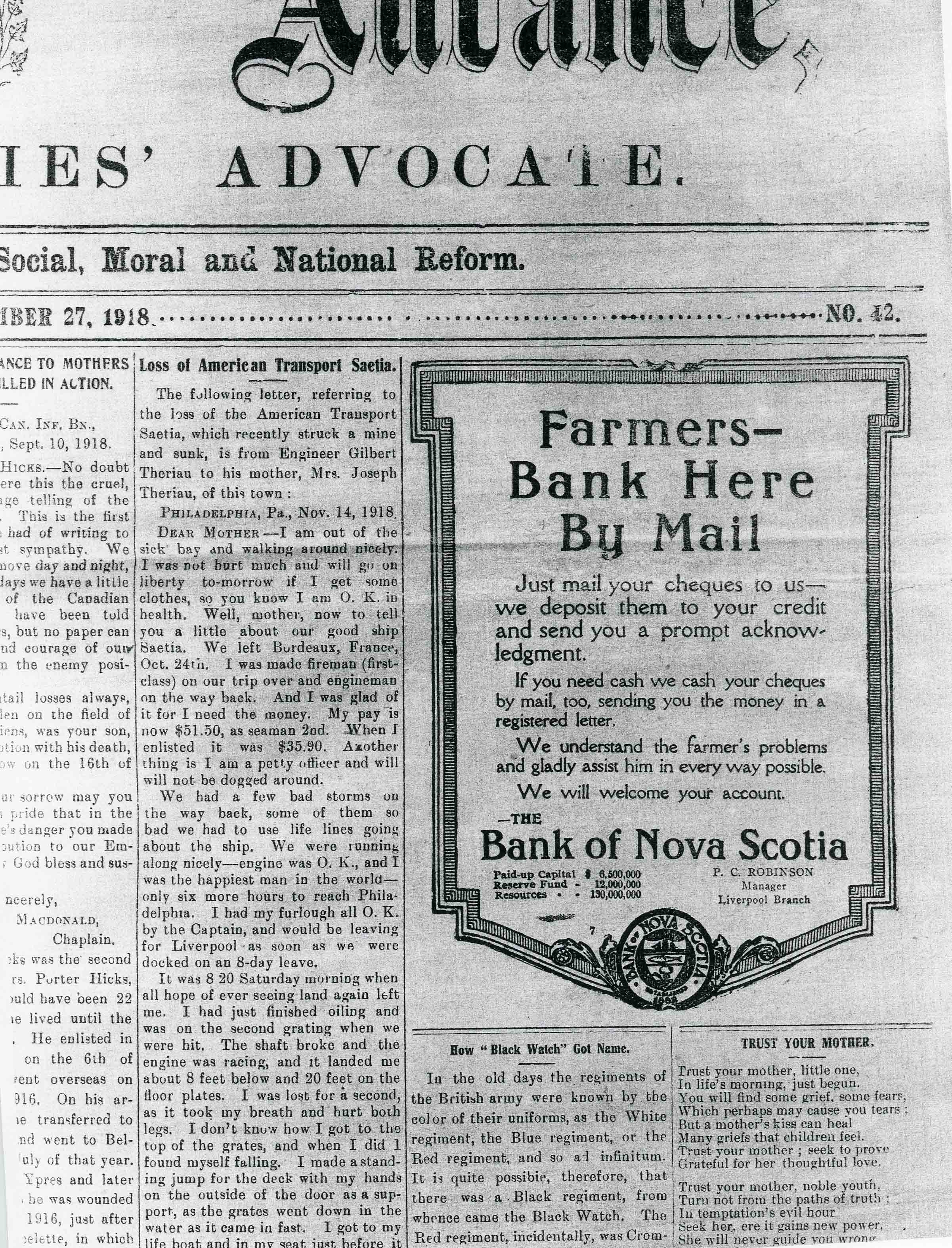 1918: Banking by mail At the start of 1918, The Bank of Nova Scotia had 192 branches spanning from coast to coast. These were to a large degree located in larger centres. To better serve those customers not in immediate proximity to a branch, and perhaps to provide an alternative to in-branch banking for those affected by or worried about the threat of influenza (which killed between 30,000 and 50,000 Canadians in 1918-1919) The Bank of Nova Scotia advertised a banking by mail service in 1918. |