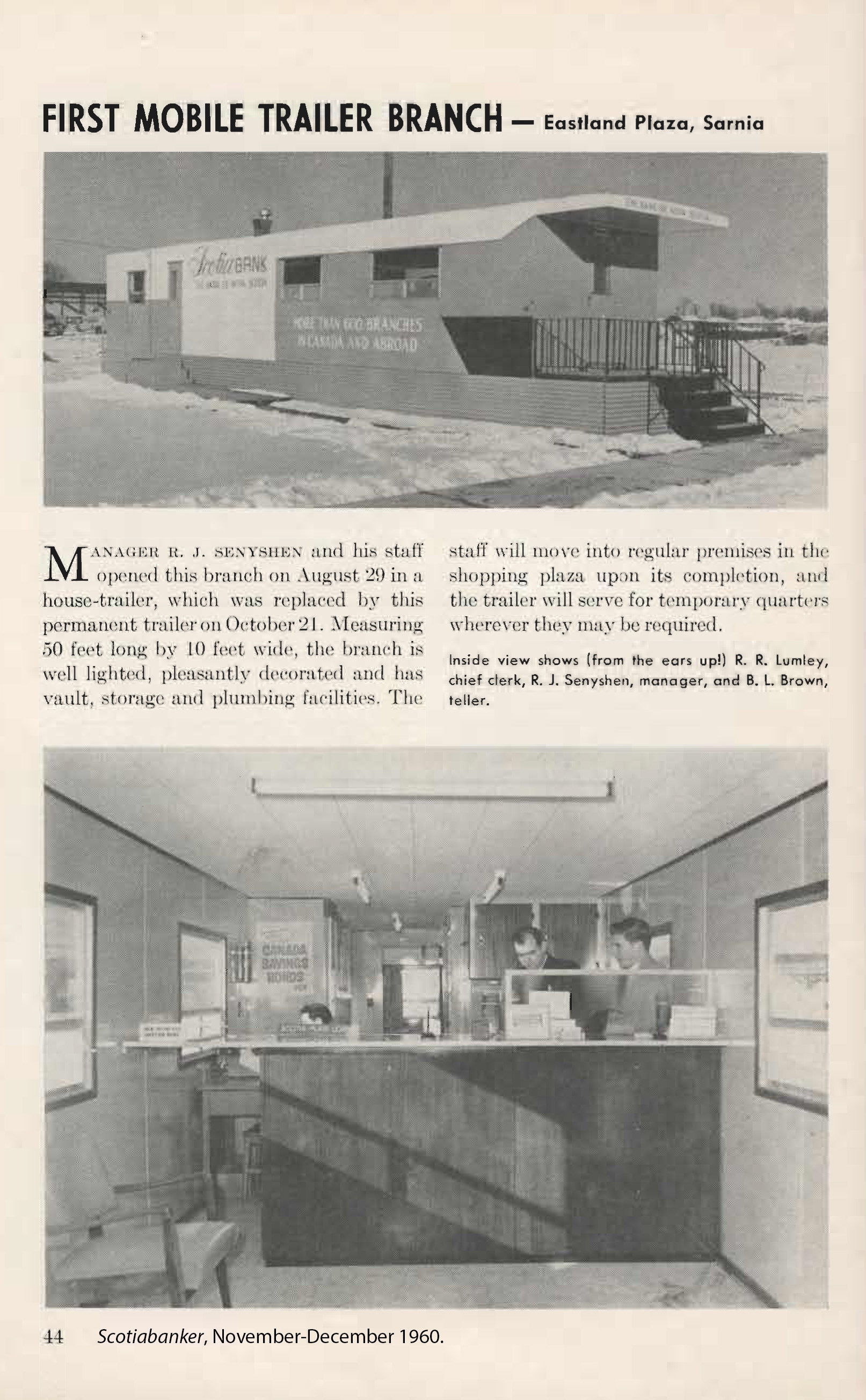 1960: Mobile Trailer Branch Why keep the customer waiting? Having arranged to open a branch in the new Eastland Plaza in Sarnia, Ontario, The Bank of Nova Scotia didn’t wait for the mall to open before starting to serve customers. Instead, they installed a trailer adjacent to the site and began offering banking services from there. This would be the first of many such temporary arrangements for the bank.