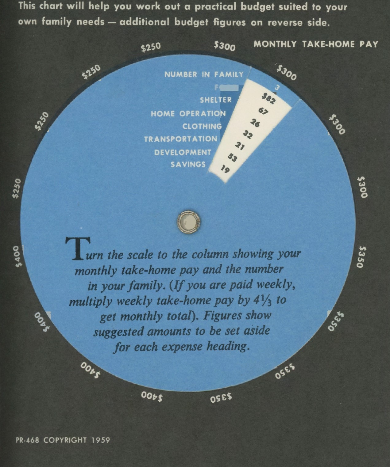 1959: Pocket Guide to Family Spending “Good money management makes for happy family living.” In 1959 The Bank of Nova Scotia distributed a Pocket Guide to Family Spending to help customers achieve peace of mind through the development of proper budgeting habits. This wheel chart, adjustable by income and family size, provided dollar figures to serve as a general guide in planning family finances.