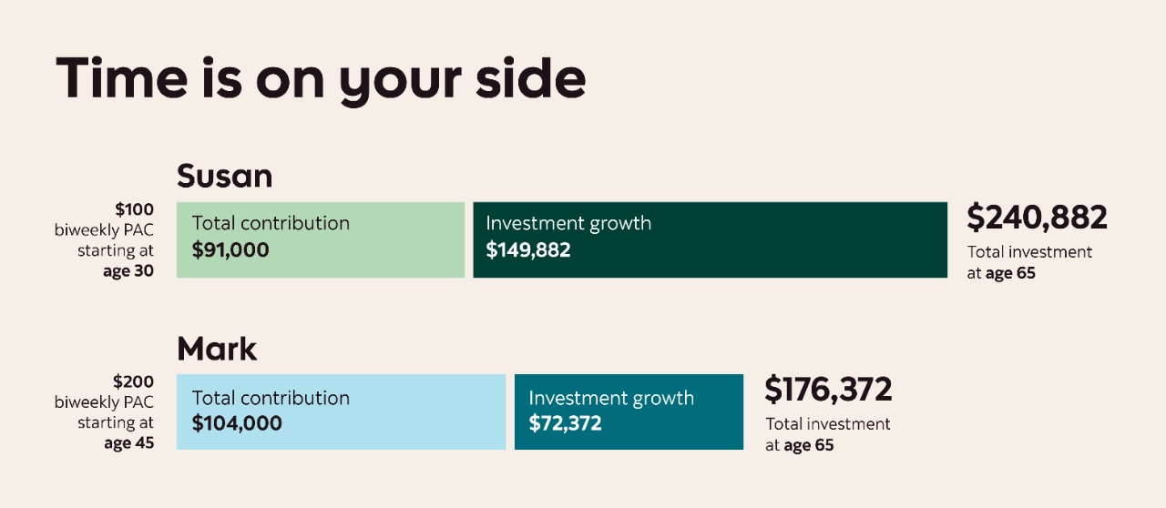 Time is on your side when it comes to contributing to an RRSP – contributing early and regularly can help you build your savings easily and automatically. Regular contributions (weekly, biweekly or monthly), boosted by the power of compound growth, can help you accumulate significant savings over time. Speak with a Scotiabank advisor about setting up a Pre-Authorized Contribution (PAC) plan that works best with your financial situation to help achieve your savings goals.