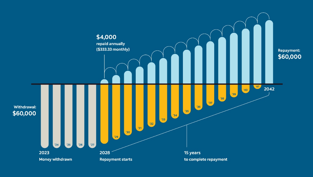 For example, if you start withdrawing money in 2023, you'll need to start repaying the funds in 2028 and will have until 2043 to complete the repayments. Let's say you took out the full $60,000. You'd owe $4,000 annually for 15 years. If you take that amount and divide it by 12, the monthly payment would be $333.33.