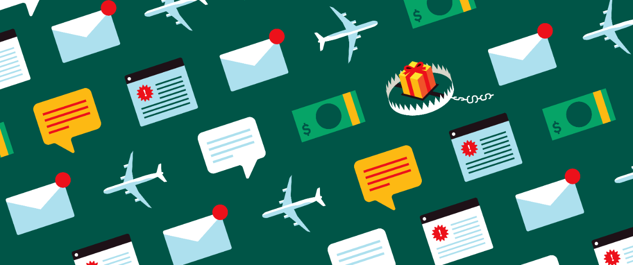 Travel scams: Texts, emails or phone calls go out offering free flights or massive discounts on holiday travel. Sometimes, they look like they're coming from legitimate hotels, airlines or other travel-related businesses. Fraudsters hope you'll give them your credit card information or click on a link to load malware onto your computer. If you get a travel offer that seems too good to be true, don't click on the link before you check the domain of the sender or go directly to the company's site.