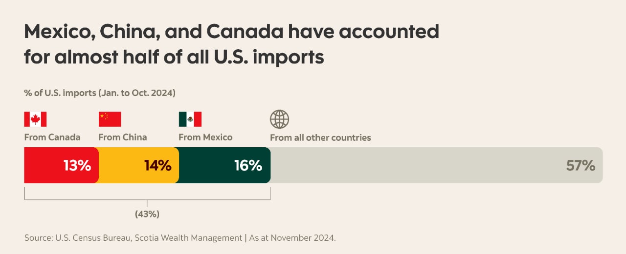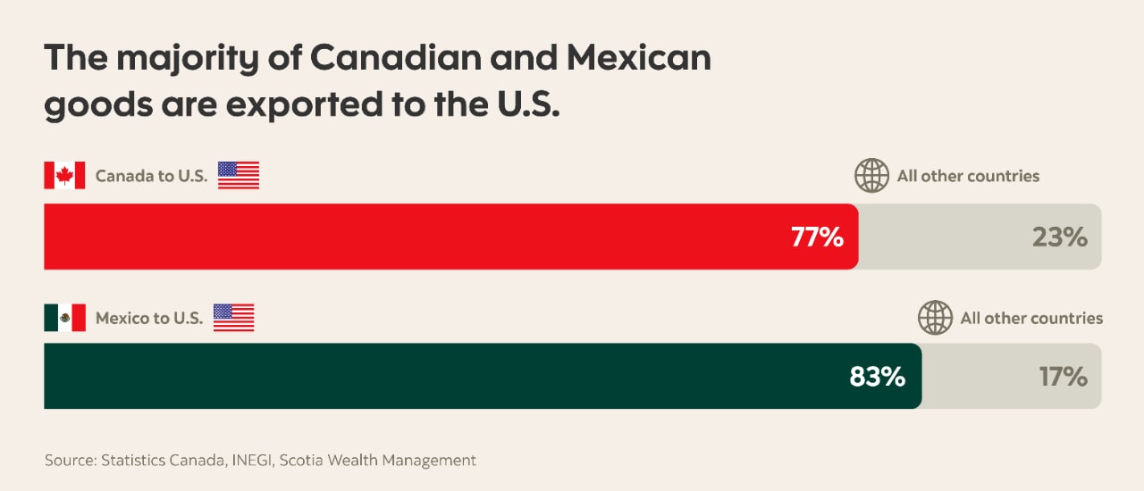 Despite the recent friction, Canada and the U.S. have a long and prosperous trading relationship. In fact, Canada, Mexico and China are the U.S.'s largest trading partners — supplying almost half of all U.S. imports (Figure 1) — while the majority of Canadian goods are exported to the U.S. (Figure 2), as noted in this report by Scotia Wealth Management1.