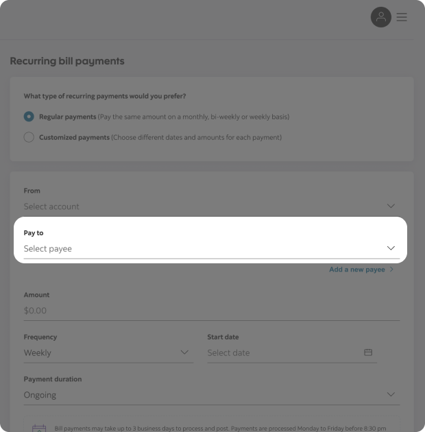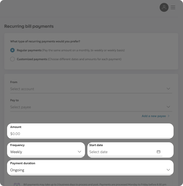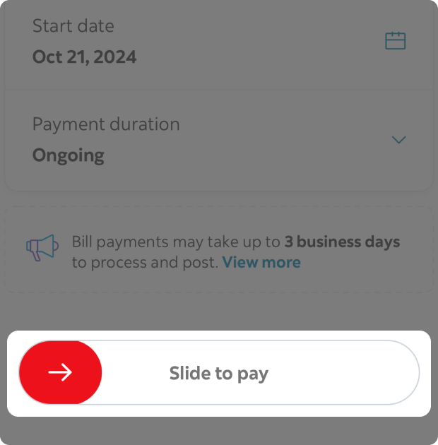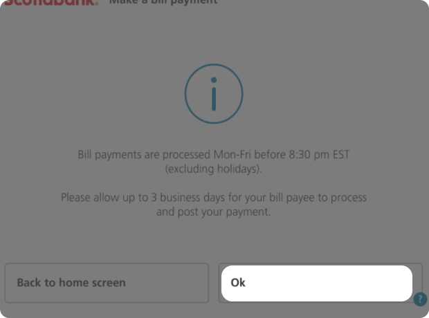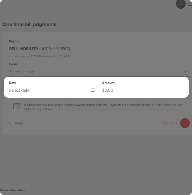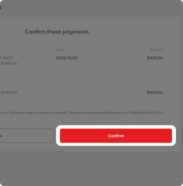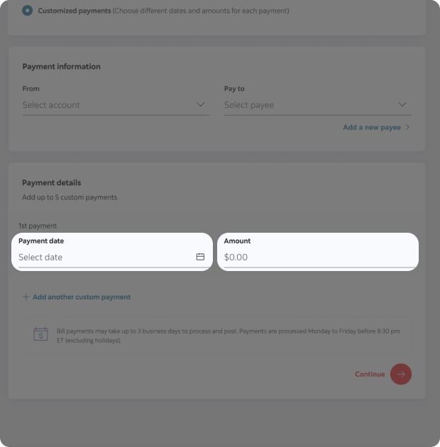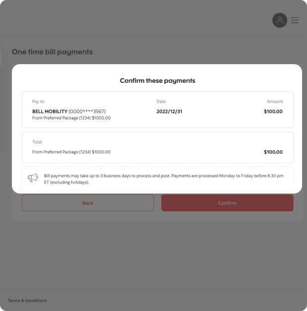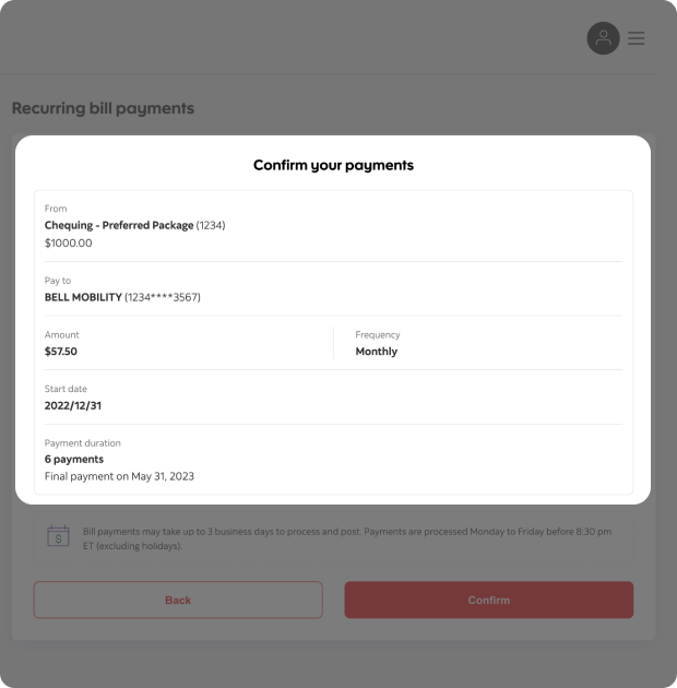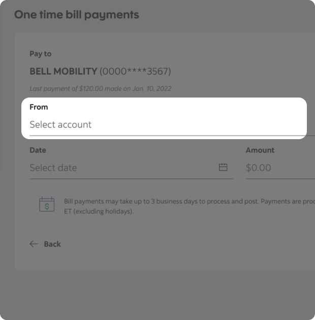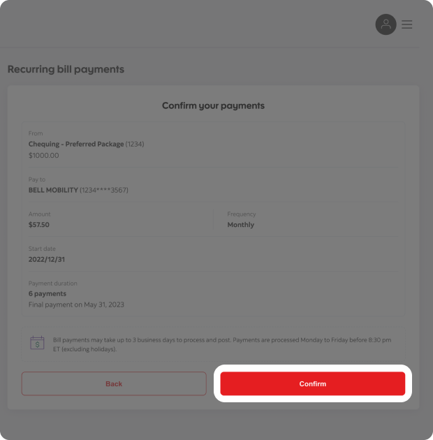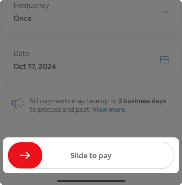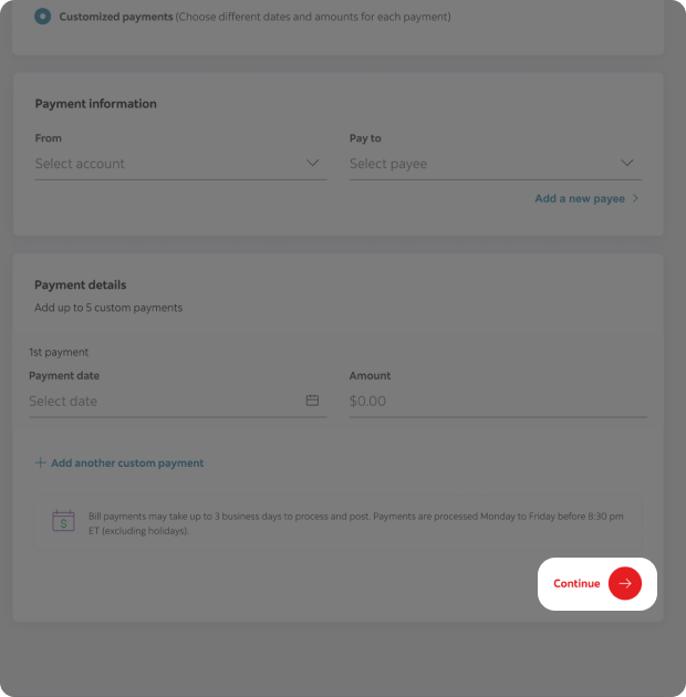 Bill payments may take up to 3 business days to process and post. Payments are processed Monday to Friday before 8:30 pm ET (excluding holidays).