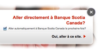 Le bandeau «Aller directement à Banque Scotia Canada» vous mènera vers le site canadien de la Banque Scotia. De plus, vous y serez automatiquement redirigé lors de vos prochaines visites.