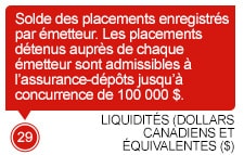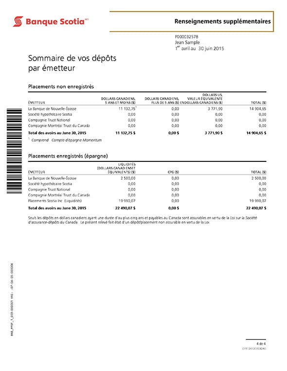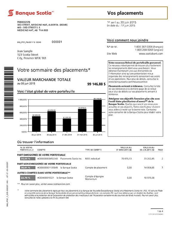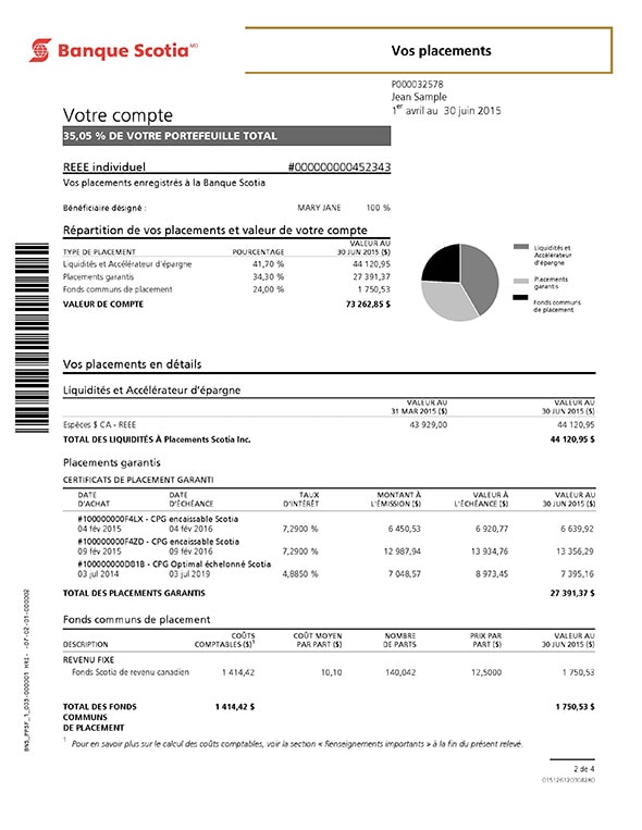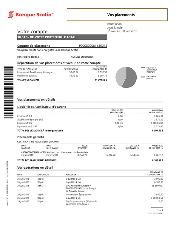 La Banque Scotia vous fera parvenir un relevé de compte périodiquement. Comme l’indique l’illustration ci-dessous, vous obtiendrez le détail de vos opérations ainsi qu’un sommaire de vos placements.