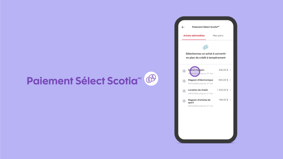 L’admissibilité à convertir un achat admissible en un plan de crédit à tempérament et les modalités qui sont offertes dépendent d’une évaluation effectuée par la Banque Scotia au moment où la conversion est demandée. Paiement Sélect Scotia est offert exclusivement sur l’appli de services bancaires mobiles de la Banque Scotia et dans Scotia en direct et uniquement au titulaire de carte principal d’un compte admissible.