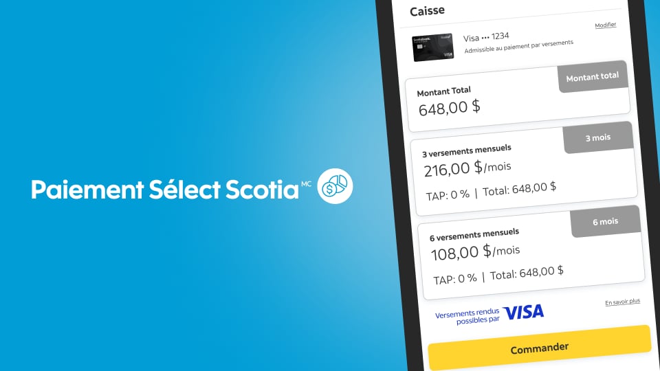 Au moment de passer à la caisse, vous pouvez choisir un plan de crédit à tempérament Paiement Sélect Scotia pour les achats admissibles que vous effectuez chez des commerçants participants. Les plans de crédit à tempérament sont rendus possibles par Visa*.