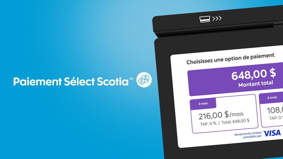 Paiement Sélect ScotiaMC, offert sans frais de plan de crédit à tempérament, vous permet de convertir en mensualités fixes les achats admissibles1 réglés avec votre carte de crédit et de profiter d’un taux d’intérêt à partir de 5,99 % durant 3 mois.