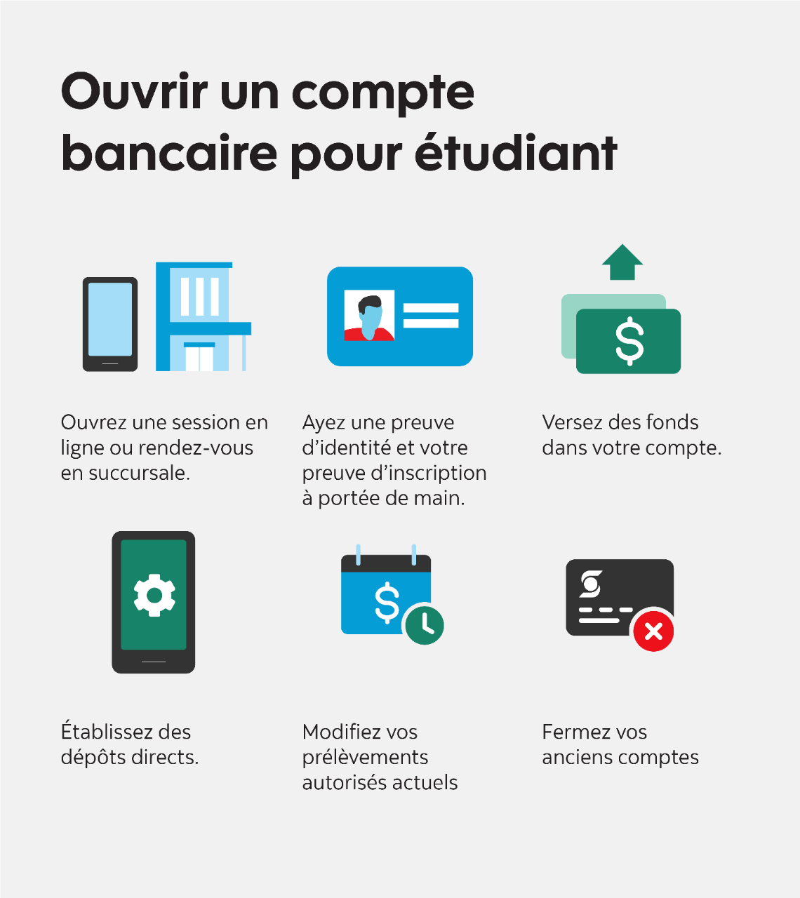 Cela ne sert à rien de payer des frais bancaires pour des comptes que vous n’utilisez plus! Penchez-vous donc sur cette tâche quand vous avez un peu de temps libre et rayez-la de votre liste de choses à faire. Une fois que c’est fait, tous vos services bancaires pour étudiants seront alors prêts pour le début de la nouvelle année scolaire.